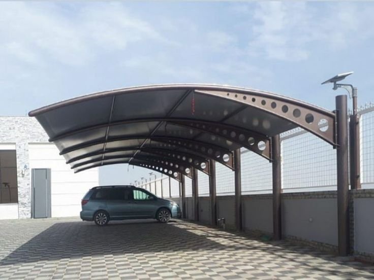 نوفر مظلات مواقف سيارات بأشكال حديثة وخامات متعددة مثل القماش PVC والحديد والساندوتش بانل، مع مقاومة كاملة لأشعة الشمس والمطر والغبار.